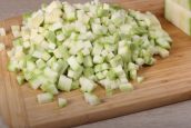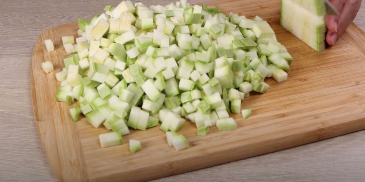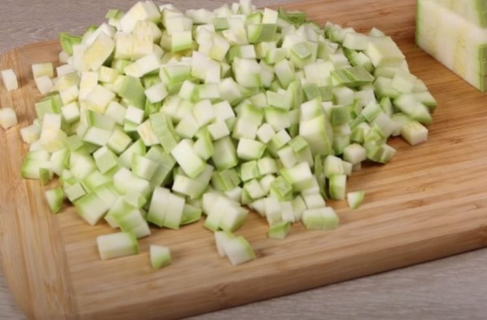 Cuketu umyjte, osušte, zbavte jí obou konců a nakrájejte ji na kostky.