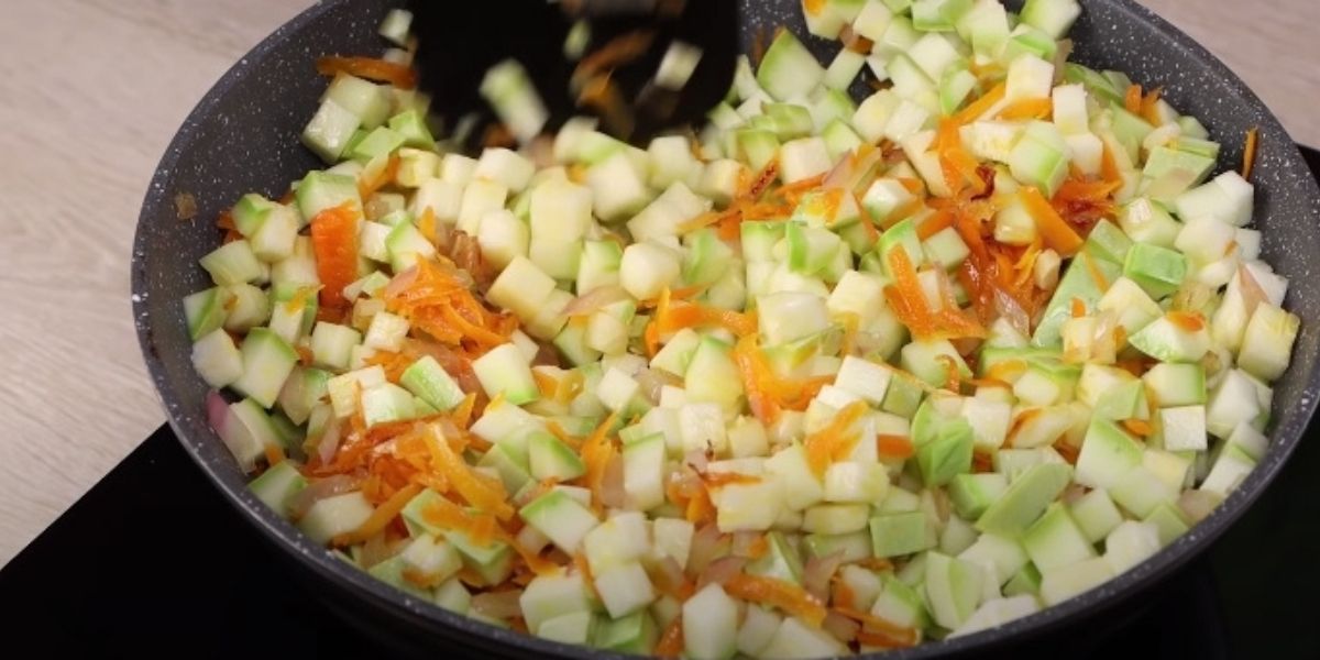 Na kamnech rozehřejte pánev s trochou rostlinného oleje (případně použijte sádlo nebo máslo, podle toho, co máte zrovna při ruce) a osmahněte na něm na středním plamenu nejprve cibuli, kterou smažte asi minutu či dvě, pak přidejte mrkev, tu smažte další minutu a nakonec přidejte cuketu. Podle chuti ji osolte a opepřete, pánev zaklopte pokličkou a restujte vše dalších 10 až 15 minut.