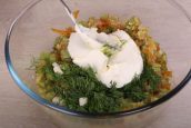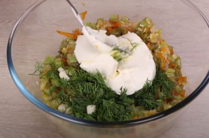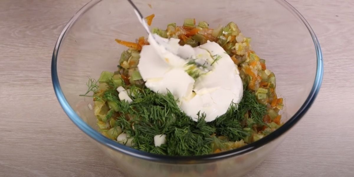 Čerstvý kopr omyjte pod proudem studené vody a osušte ho papírovými utěrkami od přebytečné vody. Ostrým nožem ho pak nasekejte najemno a přidejte ho do mísy s restovanou zeleninou.