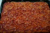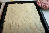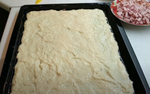 Připravte si plech standardní velikosti. Olejem ho dostatečně vymažte, aby se na něj těsto nepřilepilo. Polotekuté těsto přelijte do plechu a rovnoměrně ho rozetřete po celém povrchu plechu pomocí stěrky nebo lžíce. Získáte obdélníkovou pizzu, ze které se pohodlně nají celá rodina. Díky tomu nebudete muset řešit pečení dvou kusů.