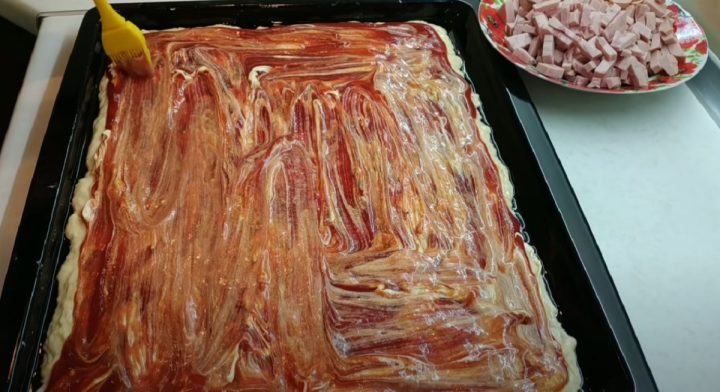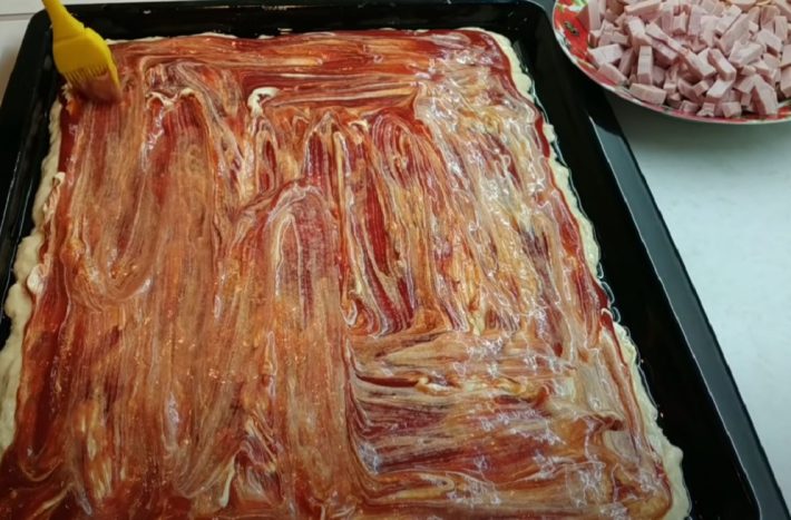 Na povrch těsta naneste kečup a majonézu podle toho, co máte rádi. Můžete si pochopitelně připravit i vlastní rajčatovou omáčku na pizzu, která bude chutnat zajisté mnohem lépe než kečup. Množství a použité suroviny přizpůsobte svých chutím. V každém případě omáčku rovnoměrně rozetřete silikonovým štětcem.