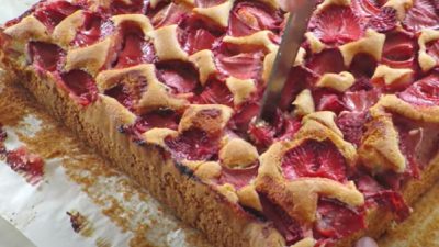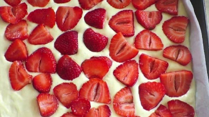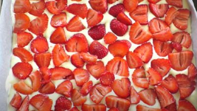 Těsto pokryjte nakrájenými jahodami a pečte ho v předehřáté troubě na 180 °C po dobu 55–60 minut.