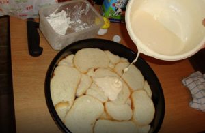 Vyklepněte dvě vajíčka do misky, přilijte k nim smetanu a vsypte nastrouhaný sýr. Podle chuti osolte a opepřete a metličkou vyšlehejte do jednolité směsi. Tou pak přelijte rovnoměrně všechny plátky veky vyrovnané v pánvi. Dejte pozor, aby žádná část vekového korpusu nezůstala suchá. Vajíčko ho totiž bude držet pohromadě jako lepidlo.