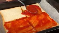 Na plech, pokrytý pečicím papírem, vyskládejte 4 krajíce toustového chleba tak, abyste získali jeden větší čtverec.