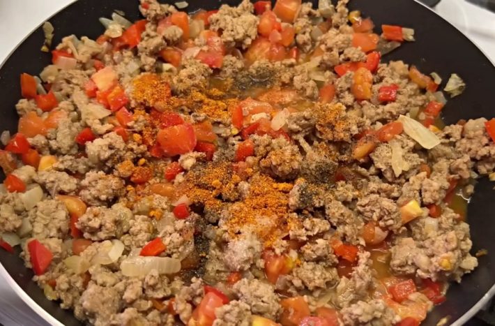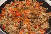 Oloupejte rajče ze slupky (nejlépe to půjde tak, že nakrojíte po obvodu špičkou nože slupku, rajče vložíte do cedníku, spaříte ho vroucí vodou a slupku jednoduše stáhnete dolů). Očištěné rajče nakrájejte na drobounké kostičky, které přidejte do pánve k masové směsi. Promíchejte, posypejte 1 lžičkou soli, půl lžičkou pepře, 1 lžičkou sladké papriky a stejným množstvím sušené bazalky. Směs dobře promíchejte a pokračujte ve smažení, dokud se z pánve neodpaří veškerá voda.