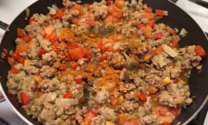 Mezitím nakrájejte druhou cibuli nadrobno a zpěňte ji v pánvi s trochou rostlinného oleje. Nakrájejte červenou papriku na drobné kostičky, které osmažte spolu s cibulí. Prolisujte do směsi dva stroužky česneku, přidejte mleté maso a vařečkou ho co nejvíce rozdělte na kousky, aby se nespeklo do jedné veliké koule.