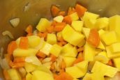 Brambory oloupejte, nakrájejte na malé kostičky a přihoďte je do hrnce k restované zelenině. Ještě chvilku vše společně opékejte a přilijte 2 litry vody. Přidejte jednu čajovou lžičku soli, promíchejte, přiklopte pokličkou a nechte na mírném ohni vařit 20 až 25 minut.