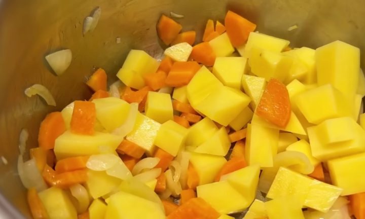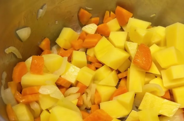 Oloupejte jednu cibuli a nakrájejte ji na čtvrtkolečka. V hrnci rozehřejte trochu rostlinného oleje, přihoďte do něj cibulku a nechte ji zesklovatět. Mezitím nakrájejte mrkev na menší kousky. Jakmile cibule v hrnci zesklovatí, přihoďte k ní mrkev, promíchejte a pokračujte v restování.