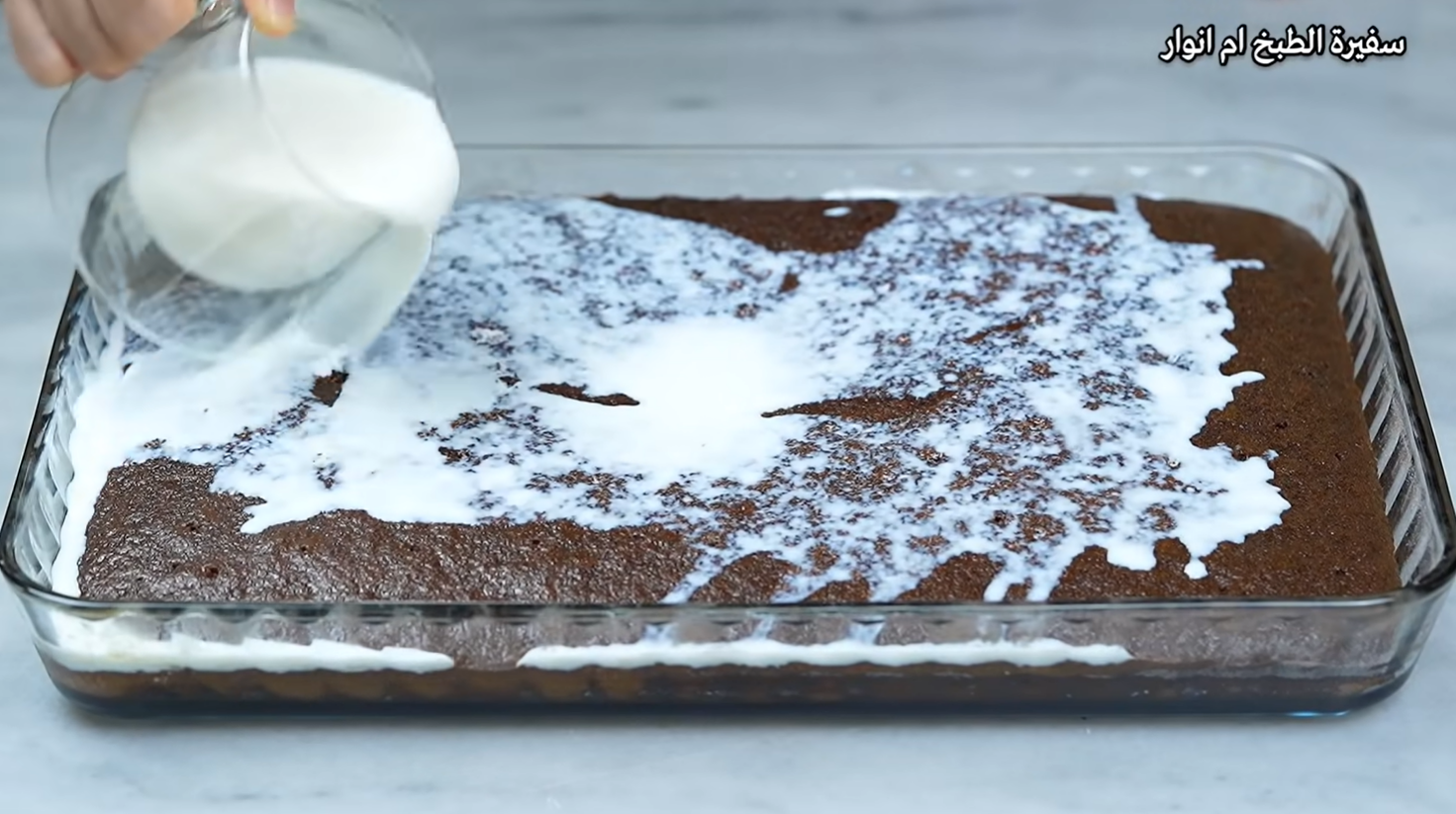 Vlijte ho do obdélníkové formy vyložené pečicím papírem, urovnejte povrch špachtlí a vložte do trouby vyhřáté na 170 °C péct po dobu kolem 25 minut. Dopečený korpus nechte vychladnout a  celý jeho povrch rovnoměrně propíchejte špejlí. Dort pak zalijte jedním hrnkem mléka a nechte ho, aby se úplně vsáklo do těsta.
