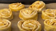 Roládu nakrájejte na kousky o šířce 2,5 cm, které vyskládejte na plech, pokrytý pečicím papírem. Rychlé banánové šneky potřete rozšlehaným vaječným žloutkem a pečte je v předehřáté troubě na 180 °C po dobu 30 minut.