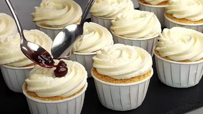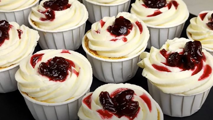 Z každého upečeného dortíku vykrojte střed, do kterého aplikujte náplň. Rychlé dortíky na závěr ozdobte krémem z vyšlehaného smetanového sýra se smetanou a cukrem, který ozdobte zbytkem náplně.