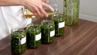 Připravte si sterilizované sklenice, které pestem naplňte a nechte je 5 minut stát. Za tuto dobu se olej začne usazovat na dně sklenice. Proto do sklenic rovnoměrně rozlijte zbytek oleje tak, aby bylo pesto ponořené.