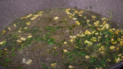Česnek nakrájejte nadrobno a smažte ho na rozpáleném oleji 1 minutu. Přidejte k němu nasekanou petrželku a pokračujte ve smažení dalších 30 vteřin.