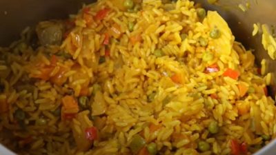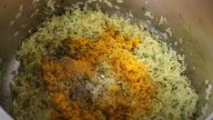 Rýži vsypte do hrnce s rozpáleným olivovým olejem, máslem, nastrouhaným česnekem a nasekaným koriandrem. Ingredience zamíchejte a smažte 1 minutu. Poté je zasypte solí, pepřem, kurkumou a přidejte k nim cibuli se zbytkem nakrájené zeleniny, včetně brambor.