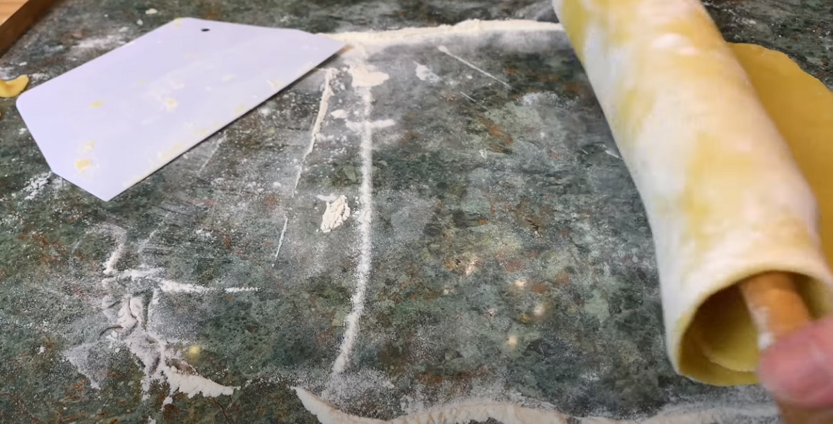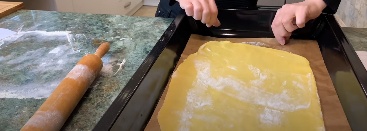 Na pracovní ploše posypané moukou rozválejte každý kousek těsta do obdélníkového tvaru o tloušťce 3-4 mm. Pomocí válečku ho z pracovní desky přesuňte na plech vyložený papírem na pečení.