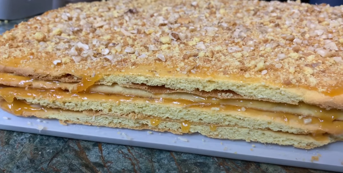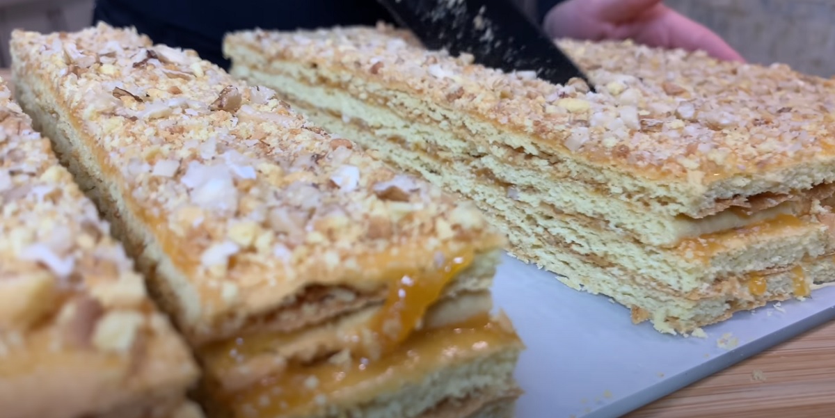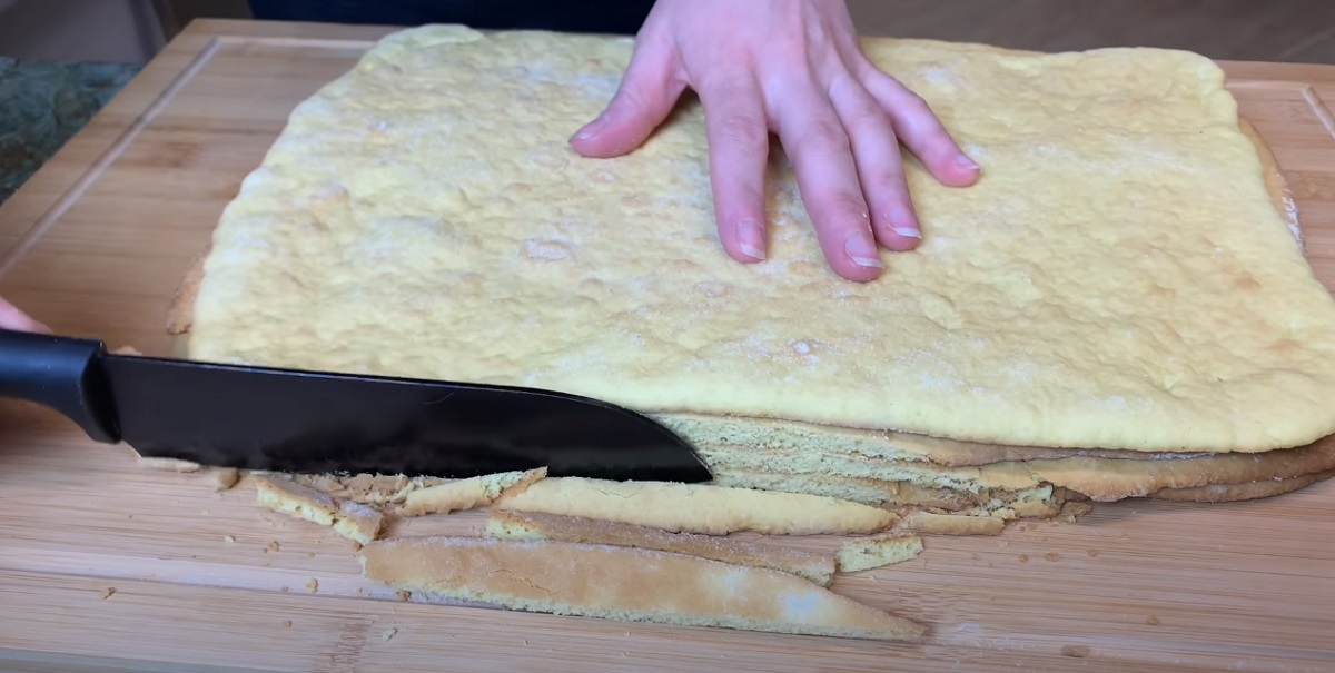 Pečte jej 10-12 minut v předehřáté troubě na 180-190 stupňů. Orientujte se podle své trouby. Upečené těsto nechte úplně vychladnout. Poté ostrým nožem trochu srovnejte hrany.