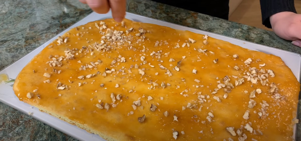 Postupujte stejně i s dalšími pláty těsta a vršek posypte dalšími ořechy.