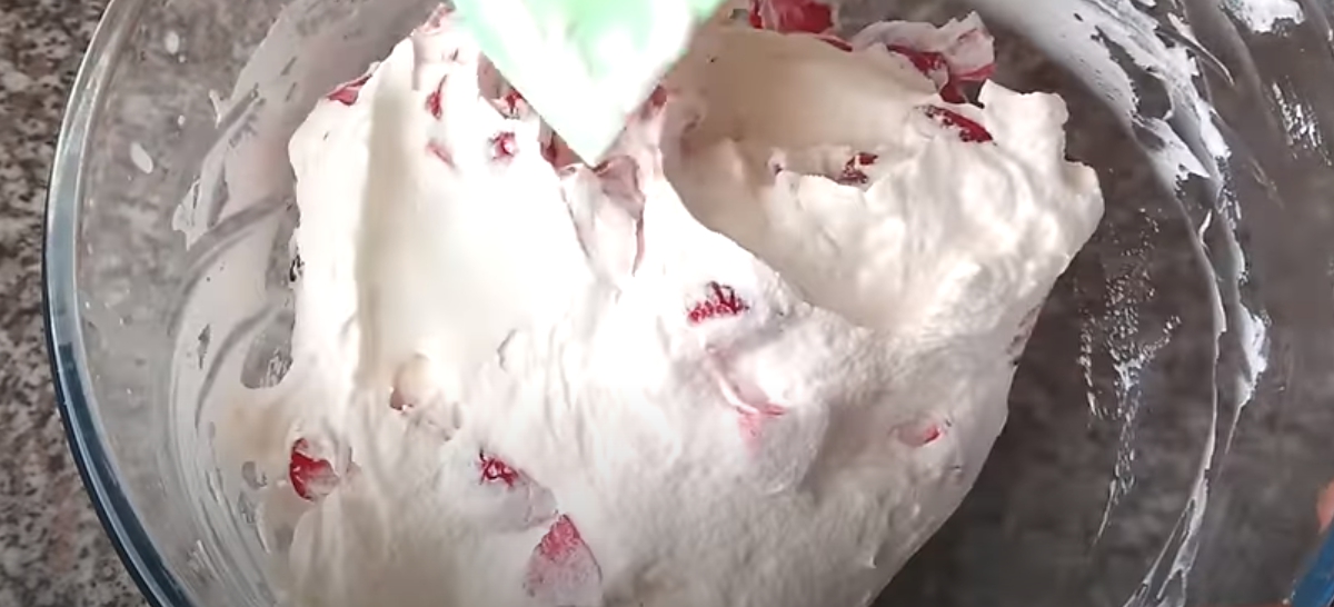 Až se korpus upeče, vyjměte jej z trouby a nechte vychladnout. Poté ho překrojte ostrým širokým nožem na dva stejné pláty. Dále se pusťte do smetanového krému. V míse si vyšlehejte do tuha smetanu a také k ní přidejte jahodový jogurt a kousky čerstvých jahod. Asi 4 kusy si nechte na ozdobu.
