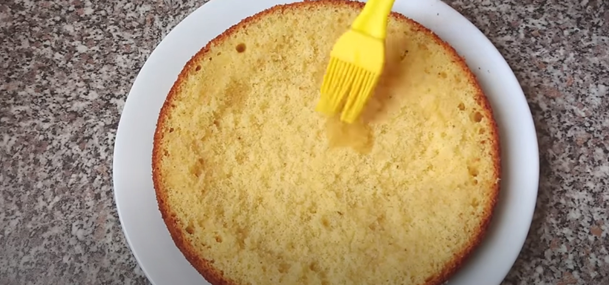 Nakonec začněte dort kompletovat. Spodní plát mírně vydlabejte a piškotové drobky dejte stranou. Poté korpus natřete sirupem.
