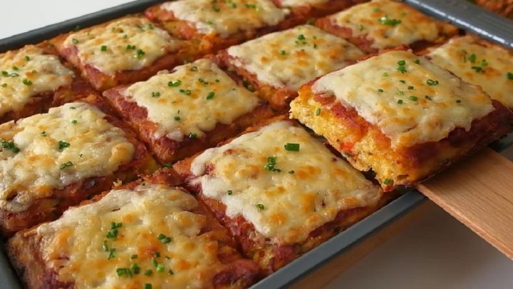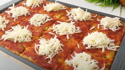 Upečený koláč nakrájejte na stejně velké kostky, které potřete rajčatovou omáčkou, posypte nastrouhaným čedarem a pokrm pečte ještě 10 minut.