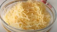 Brambory oloupejte, nastrouhejte na hrubém struhadle a ponořte je do vody na 15 minut. Mezitím smažte na pánvi s rozpáleným olejem na proužky nakrájenou cibuli po dobu 2–3 minut.