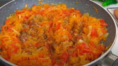 Poté k cibuli přidejte najemno nastrouhanou mrkev a nakrájenou papriku. Směs ochuťte solí, pepřem a pokračujte ve smažení další 3–4 minuty.