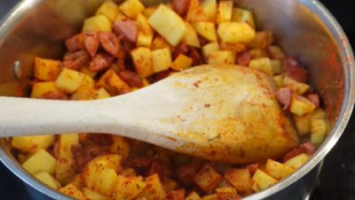 Na rozpáleném oleji smažte nakrájené párky 2–3 minuty, přidejte k němu mletou sladkou i uzenou papriku, majoránku, kmín, sůl, pepř čtyř barev a ingredience důkladně zamíchejte.