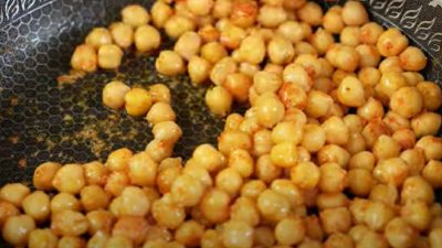 Cizrnu slijte, vložte ji do větší mísy a ochuťte ji solí, mletou sladkou paprikou, sušeným česnekem a mletým kmínem. Následně ji smažte na pánvi s rozpáleným olejem 3–4 minuty.