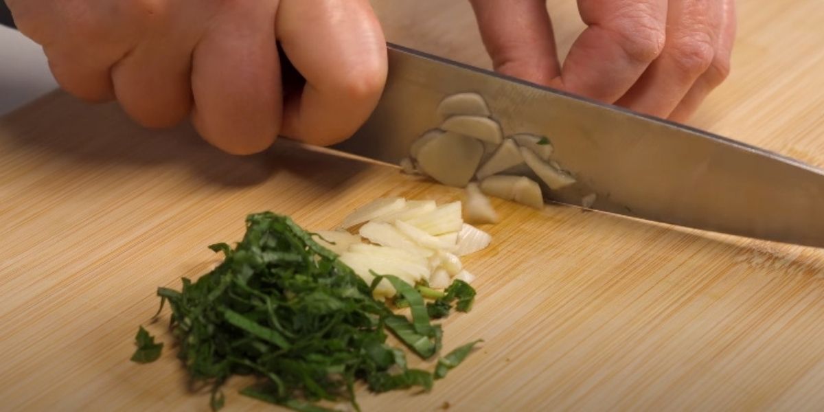Nyní nasekejte lístky bazalky a máty. Česnek nasekejte najemno, abyste v salátu nekousli do velkého kusu. To skutečně není příjemné.