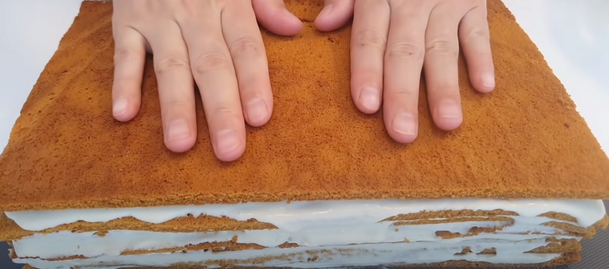 Těmi medovník obalte ze všech stran. Nakonec dezert uložte do lednice tuhnout přes noc.