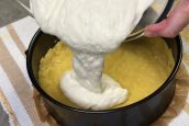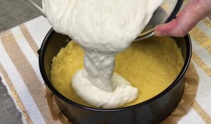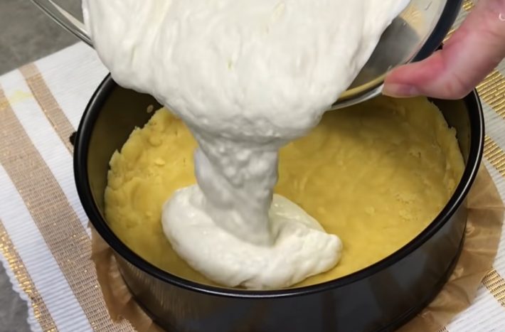 Bílky začněte šlehat. Po chvilce k nim začněte po částech přidávat citronovou šťávu a cukr. Výsledkem má být konzistence, která tvoří kopečky. Nyní k bílkům stěrkou přimíchejte řecký jogurt. Na závěr přimíchejte mouku a krém je hotový. Pečicí formu vyložte pečicím papírem a nasypejte do něj první polovinu těsta. Tu ručně a následně sklenicí přitlačte a poté zalijte krémem. Zarovnejte stěrkou a zakončete druhou polovinou těsta.