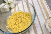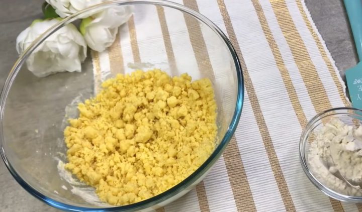 Nachystejte si dvě mísy a rovnou do nich rozdělte dvě vejce na bílky a žloutky. Ke žloutkům přisypejte cukr a zamíchejte metličkou. Přilijte máslo, které jste předtím rozpustili například v mikrovlnné troubě. Poté metličkou přimíchejte po částech mouku a prášek do pečiva. Mělo by vám vzniknout mírně drobivé těsto, do kterého můžete dle potřeby ještě ručně zapracovat lžíci mouky. Dejte na chvíli do lednice.