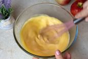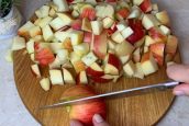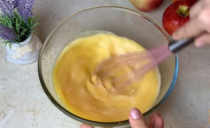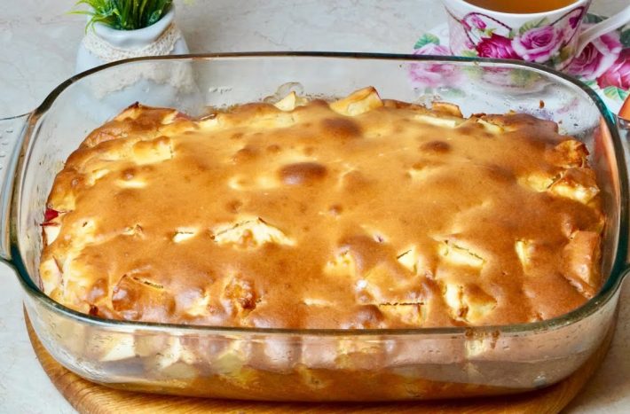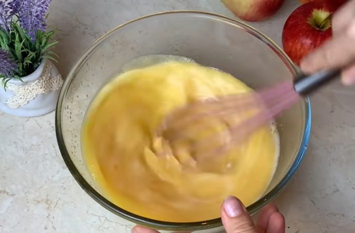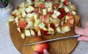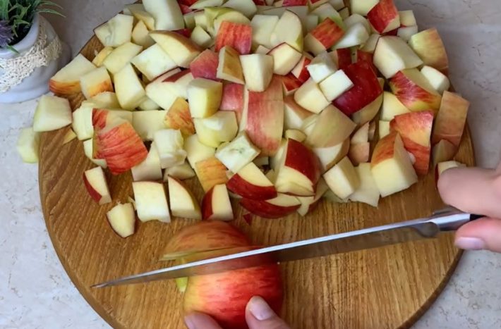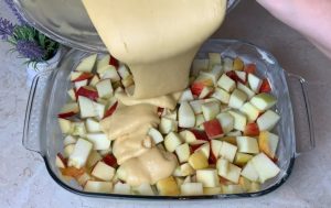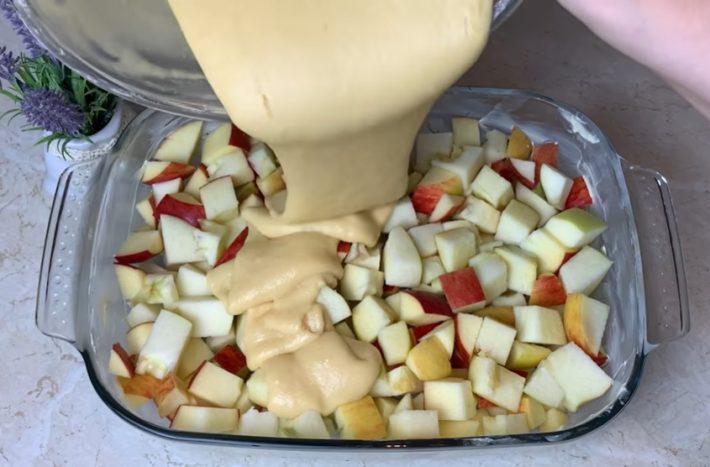 Hotové těsto dejte na chvíli stranou. Jablka rozkrojte na polovinu a opatrně vykrojte jádřinec a stopku. Pak jablka nakrájejte na malé kostičky. Vezměte hlubší pekáč a dobře ho vymažte máslem i po stěnách. Na dno naskládejte všechna nakrájená jablka a přelijte připraveným těstem. Rozetřete těsto tak, aby se dostalo do všech stran.