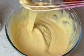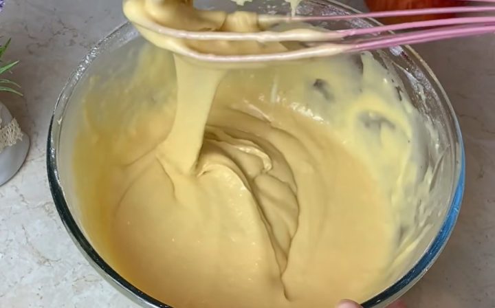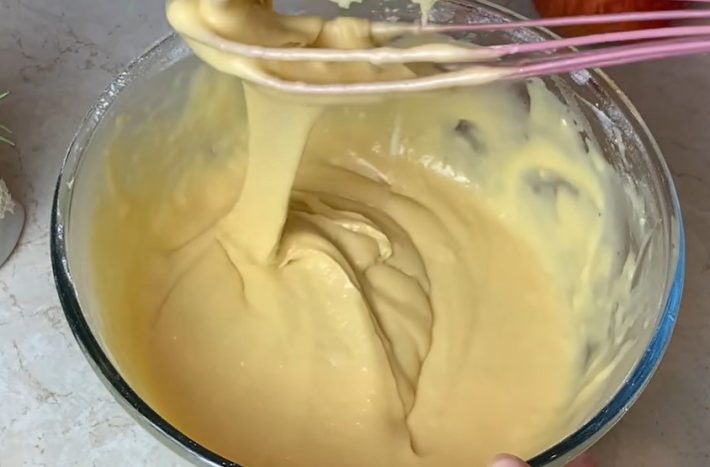 Do velké mísy rozklepněte celá vejce a přidejte oba druhy cukrů spolu se špetkou soli. Metličkou prošlehejte, dokud se na povrchu nevytvoří lehká pěna. Přidejte mléko a pokračujte ve šlehání. Máslo nechte rozehřát a přilijte k těstu. Mouku smíchejte s práškem do pečiva a směs prosejte do mísy. Dobře promíchejte do hladkého a polotekutého těsta.