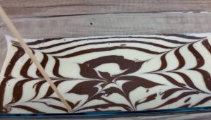 Formu na chlebíček nebo menší pekáček si vymažte olejem. Dejte na jeho dno do středu 4 lžíce tmavého těsta, poté 4 lžíce světlého, pak zase 4 lžíce tmavého a opakujte, dokud těsto nedojde. Pak těsto špejlí ozdobte viz video.