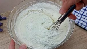 Do mísy dejte vejce, cukr, sůl a vanilkový cukr a vše vyšlehejte do pěny. Poté přilijte slunečnicový olej a 180 mililitrů mléka a opět prošlehejte. Prosejte polovinu mouky a přidejte prášek do pečiva. Pak prosejte do mísy i druhou polovinu mouky a zase promíchejte.