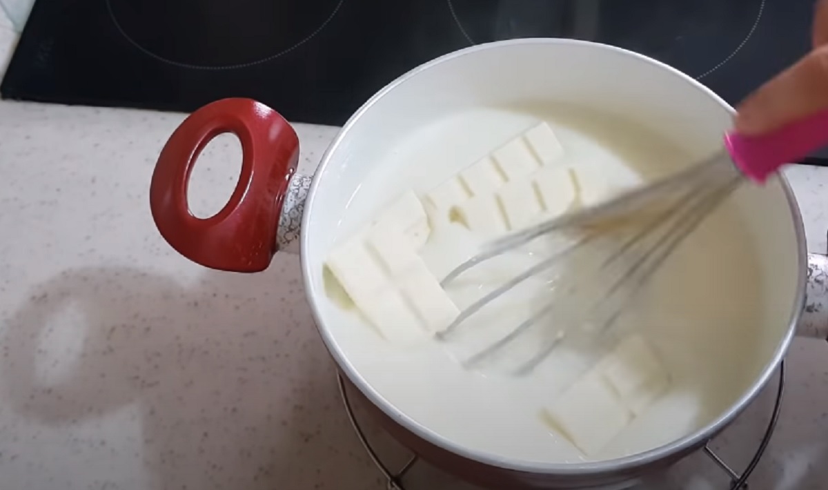 Do horkého krému nalámejte bílou čokoládu a míchejte, dokud se nerozpustí a nevytvoří jednolitou konzistenci.