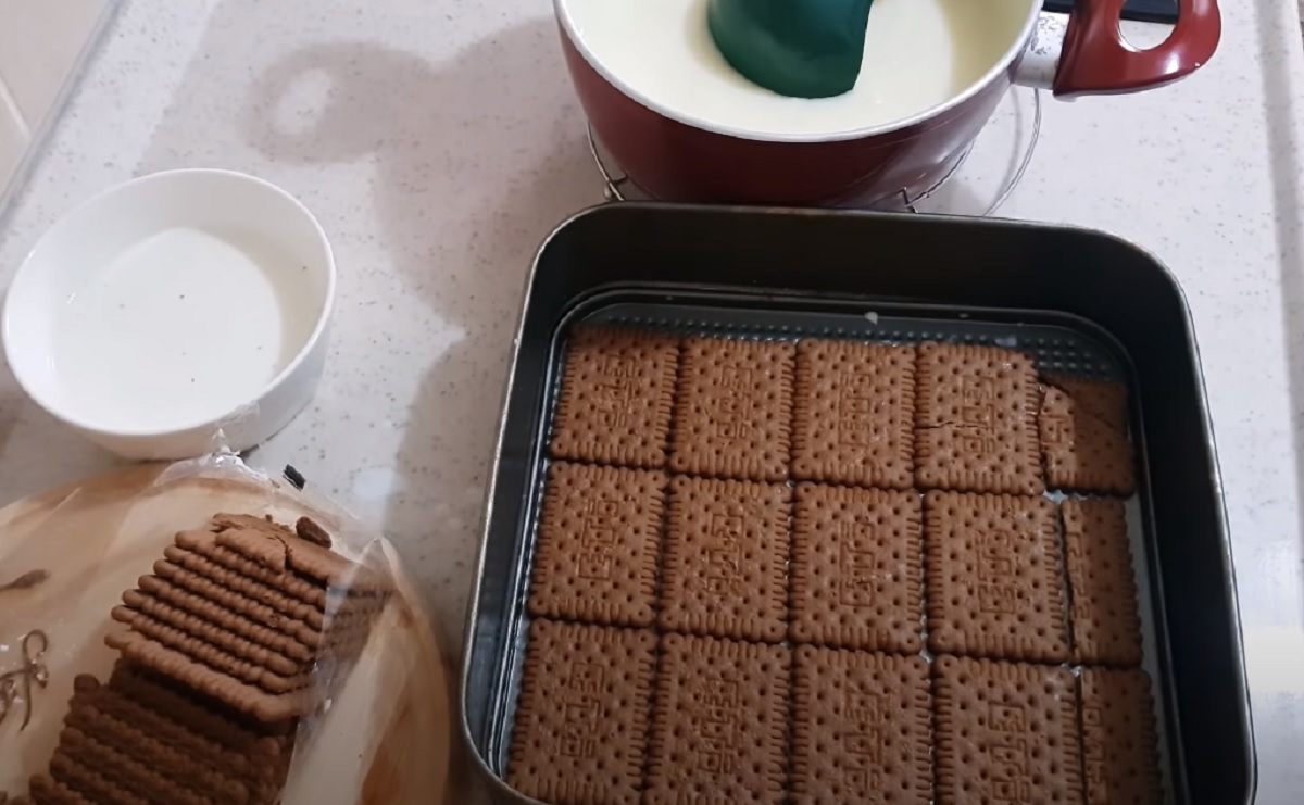 Připravte si obdélníkový plech nebo tác. Každou sušenku namočte do mléka a nechte ji 3 vteřiny nasáknout a vložte ji do formy. Takto vytvořte základnu dortu o rozměrech zhruba čtyři krát čtyři sušenky.