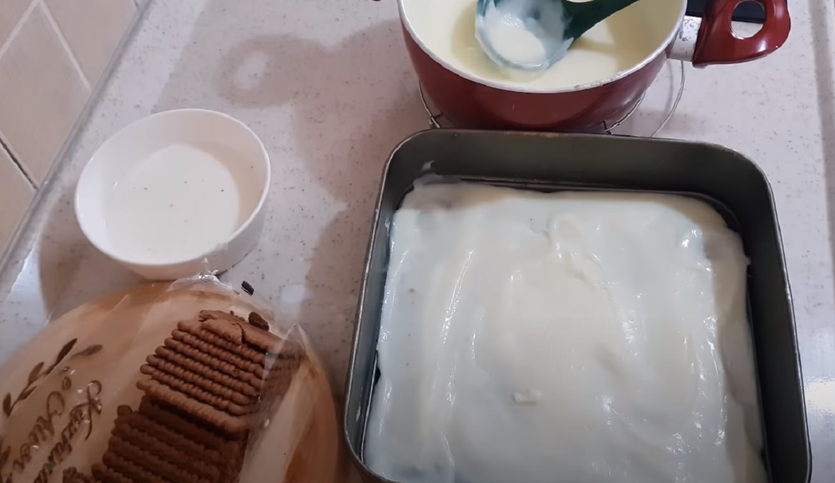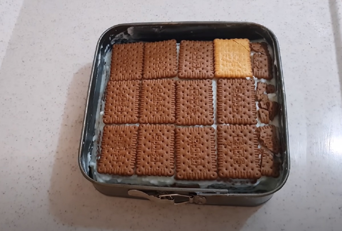 Na ni opět vyrovnejte vrstvu sušenek namočených v mléce a takto střídejte vrstvy, dokud vám nedojdou suroviny, přičemž poslední vrstvu tvoří sušenky.