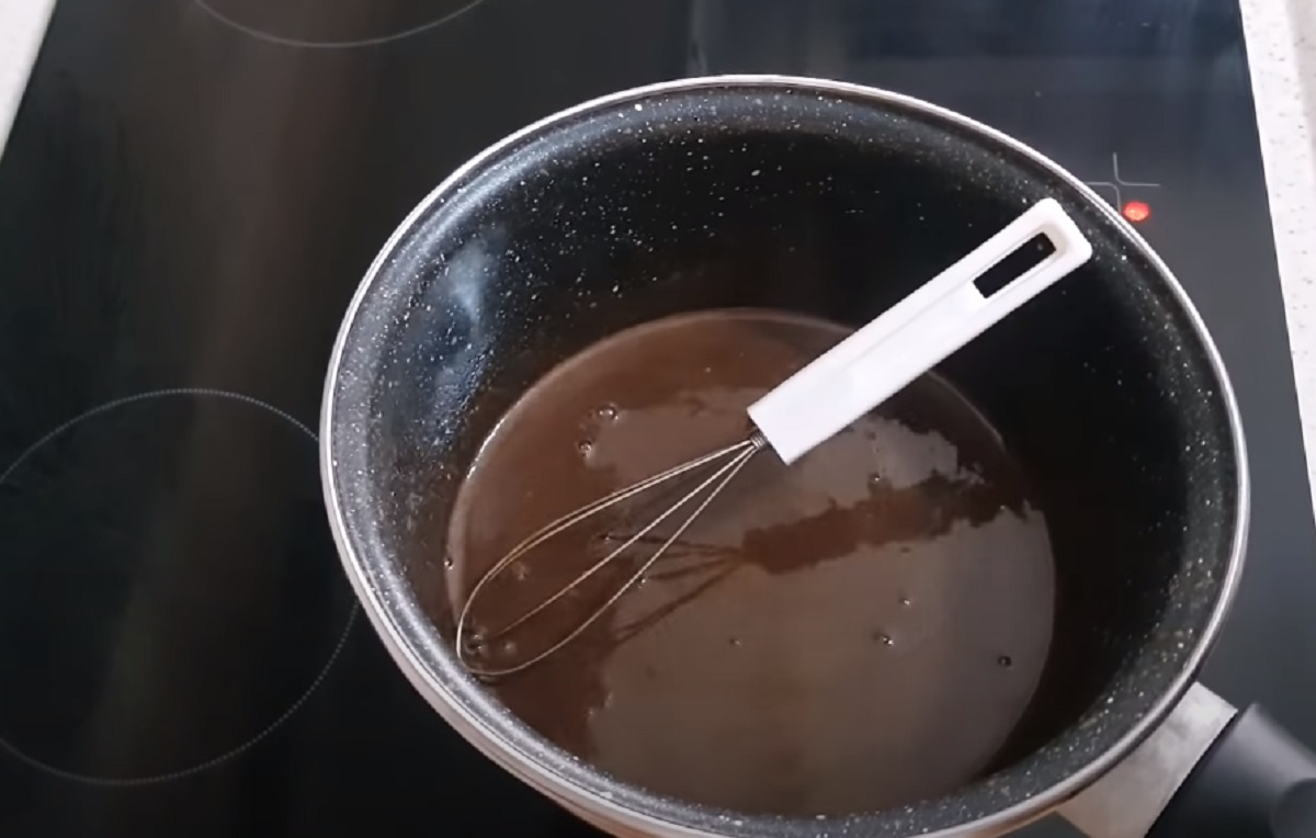 Do kastrůlku nalijte mléko, přidejte tmavou čokoládu, kterou jste předtím nalámali na menší kousky, a na mírném ohni zahřívejte, dokud se čokoláda nezačne rozpouštět. Metličkou míchejte, dokud nezískáte homogenní směs.