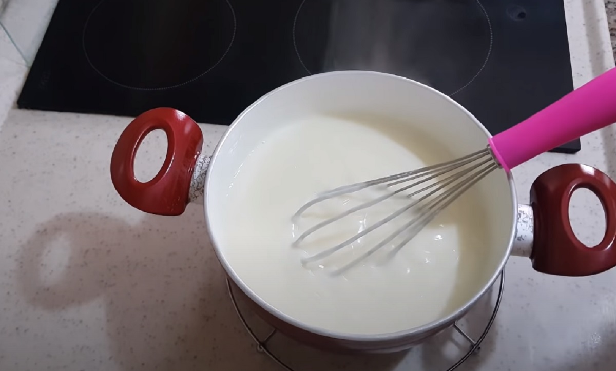Nejprve připravte krém. Do kastrůlku se silným dnem nalijte mléko, přidejte krystalový a vanilkový cukr, mouku a kukuřičný škrob, metličkou dobře promíchejte, aby ve směsi nezůstaly hrudky a na mírném ohni přiveďte k varu. Když směs začne bublat, vařte 2 až 3 minuty za stálého míchání, dokud krém nezhoustne a odstavte z ohně.