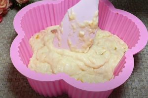 Připravte si formu odpovídající velikosti. Může být silikonová nebo kovová, ale tu budete muset vymazat máslem a vysypat moukou, případně vyložit pečicím papírem. Těsto nalijte do formy. Troubu rozehřejte na 180 °C a pečte 40 minut.