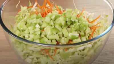 Zelí nakrájejte na tenké nudličky, které smíchejte s nastrouhanou mrkví a nakrájenou okurkou.