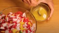 Přidejte také nadrobno nakrájený tvrdý sýr s ředkvičkami a vše zalijte směsí oleje, octa, medu, hořčice, soli a pepře.