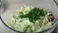 K ingrediencím přidejte nakrájené čínské zelí s nasekanou petrželkou a poté připravte zálivku. Olej smíchejte s citronovou šťávou, prolisovaným česnekem, pepřem, solí a hořčicí.