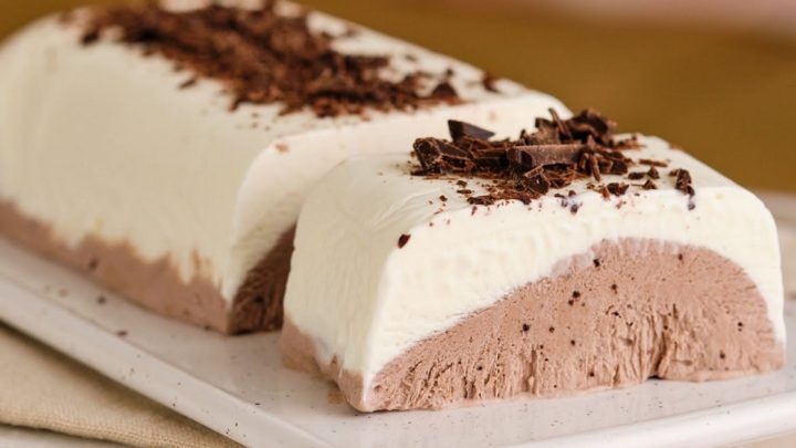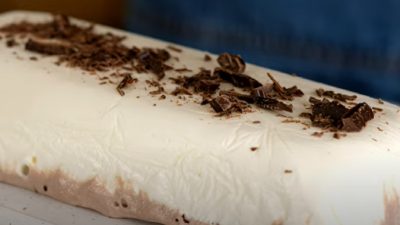 Kakaovou směsí pokryjte světlý základ a rychlý zmrzlinový chlebíček vložte na 4 hodiny do mrazáku. Následně ho z formy vyklopte a ozdobte čokoládou.
