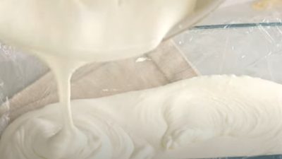 Smetanu vyšlehejte dotuha a přidejte do ní kondenzované mléko, za stálého šlehání. Polovinu směsi nalijte do formy, vyložené potravinovou fólií a do druhé půlky vmíchejte kakao.