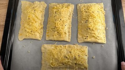 Na závěr taštičky potřete rozšlehaným vejcem, posypte sezamovými semínky a nastrouhaným sýrem. Následně je vyskládejte na plech, pokrytý pečicím papírem a pečte je v předehřáté troubě na 180 °C po dobu 15–20 minut.