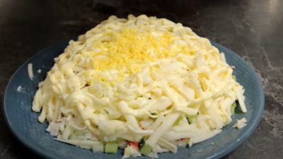 Majonézu pokryjte nakrájenými krabími tyčinkami a ty také polijte majonézou, kterou posypte najemno nakrájenou salátovou okurkou, z které předem odstraňte okraje.