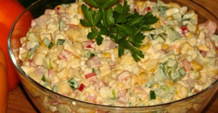 Poté je vložte do mísy a smíchejte s šunkou nakrájenou na menší kousky. Dále přidejte i zeleninu: oloupanou a pokrájenou salátovou okurku, očištěnou a na proužky nakrájenou papriku a konzervovanou kukuřici.